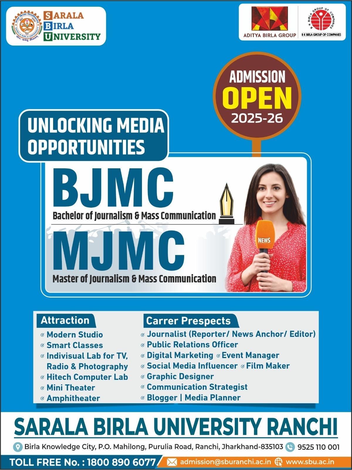 Sarala Birla University offers a 𝑩𝒂𝒄𝒉𝒆𝒍𝒐𝒓 𝒐𝒇 𝑱𝒐𝒖𝒓𝒏𝒂𝒍𝒊𝒔𝒎 𝒂𝒏𝒅 𝑴𝒂𝒔𝒔 𝑪𝒐𝒎𝒎𝒖𝒏𝒊𝒄𝒂𝒕𝒊𝒐𝒏 & 𝑴𝒂𝒔𝒕𝒆𝒓 𝒐𝒇 𝑱𝒐𝒖𝒓𝒏𝒂𝒍𝒊𝒔𝒎 𝒂𝒏𝒅 𝑴𝒂𝒔𝒔 𝑪𝒐𝒎𝒎𝒖𝒏𝒊𝒄𝒂𝒕𝒊𝒐𝒏 with exceptional learning outcomes including world-class infrastructure, renowned faculty, and assured support for internships and placements at leading organisations. Admissions are open for session 2025-26.